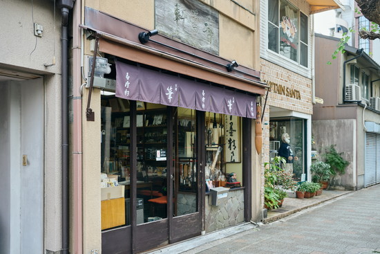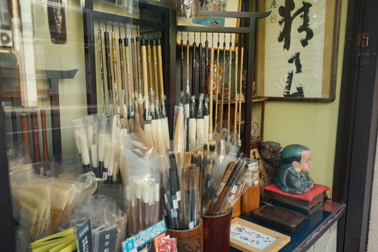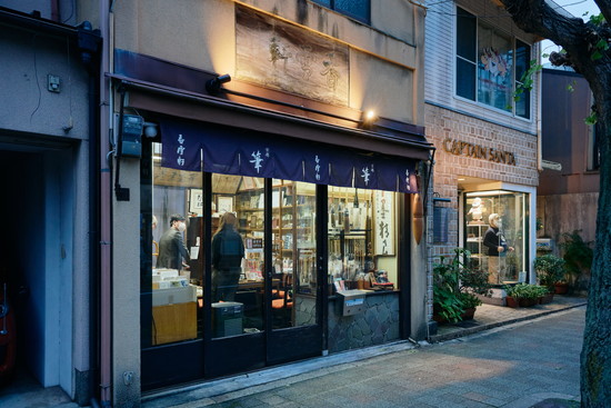 江戸時代後期、筆職人だった初代が創業。厳選した獣毛、素材を使用し熟練の技で手作りされるオリジナルの筆に、硯、墨、紙を加えた「文房四宝」を扱います。その高い品質と誠実な商いは広く評判を呼び、名だたる文人墨客にも愛されてきました。富岡鉄斎氏、谷崎潤一郎氏、武者小路実篤氏など、歴代の華やかな交流の軌跡は、店内の扁額からもうかがい知ることができます。五代目当主の長岡輝道さんが店を守り継ぐ今も、世界的に活躍する書や画の専門家、京の寺社仏閣や老舗など、幅広い層から並々ならぬ信頼を集めています。だからといって初心者や旅行者が入るのに気後れするような店ではなく、訪れれば「何にお使いになりますか」と和やかに話しかけてくれる気さくな雰囲気。豊富な品揃えのなかから、手へのなじみ、書き味などを試しながら、用途や好みに応じた筆を選ぶことができます。店主ご夫妻との心あたたまるコミュニケーションを楽しみに、日本全国また海外からお客さまがおいでになるというのにもうなずけます。老舗の情緒と深い懐を感じながら、あらためて筆を使う楽しみに出会える店といえるでしょう(上の写真は限定品の「御題筆」)。