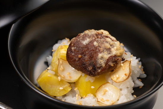 【栗ご飯】栗ご飯は、栗の風味を移した昆布出汁で炊いています。上に乗せた大きな渋皮付きの栗は、蒸した渋を素揚げにしています。海外の方にご飯を出す時は、白ご飯の割合を4割程度にして、具材は多めにします。今回は素揚げした百合根も添えて、風味に膨らみをもたせました。