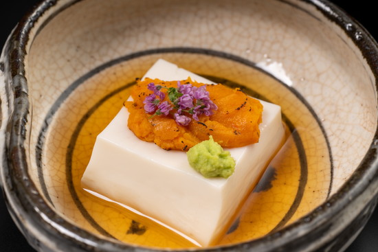【先付】胡麻豆腐に野菜でつくった焼き雲丹もどきを添えています。焼き雲丹もどきの生地は1時間ほど揚げて味を濃縮させたかぼちゃに、赤ピーマンを合わせました。基本となる生地に、何を合わせるかで味の方向性が決まります。焼き目もつけて、もどき料理を表現しています。