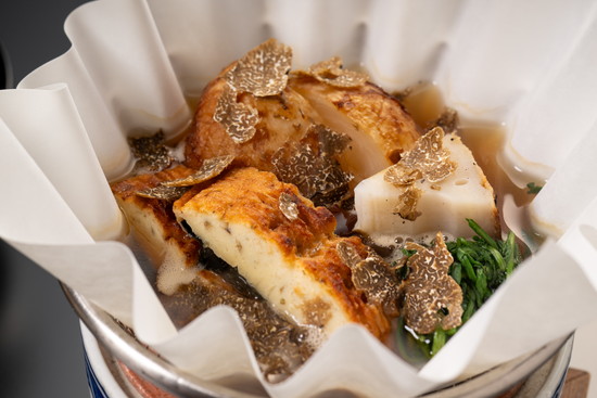 その本領発揮とばかりに、撮影現場に運び込まれた紙鍋の仕上げにはシュシュッとトリュフを削り入れ、その姿に期待が高まります。