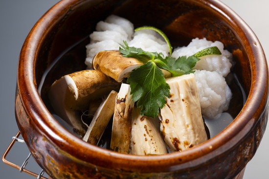 秋は食材が豊富ですので、いろんな料理がつくれますね。今回は魚を何にするかを決めるところから始め、魳(八寸)と鯛(向付)、そしてこの時期に外せない鱧を使うことにしました。鱧は松茸とともに小鍋仕立てにしましたが、鱧松茸はお客様が毎年楽しみにしておられる料理。定番の味は、長年にわたって多くの方が美味しいと感じてこられた証ですね。